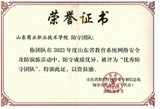 【建新功——見亮點成效】山東商職學院獲評2023年度山東省教育系統網絡安全攻防演練“優秀防守團隊”