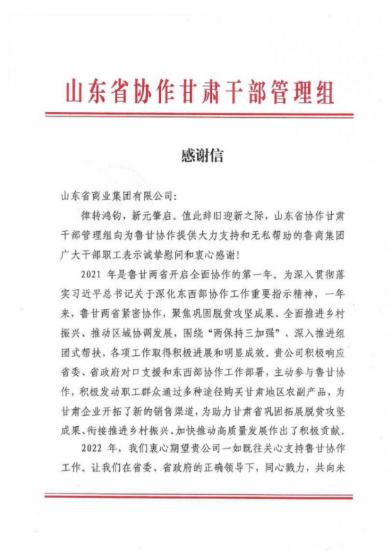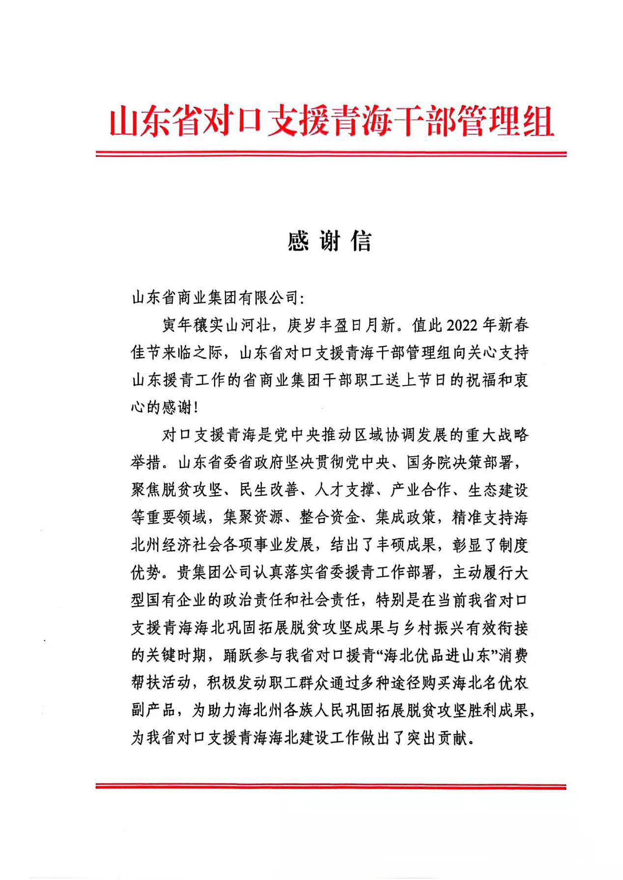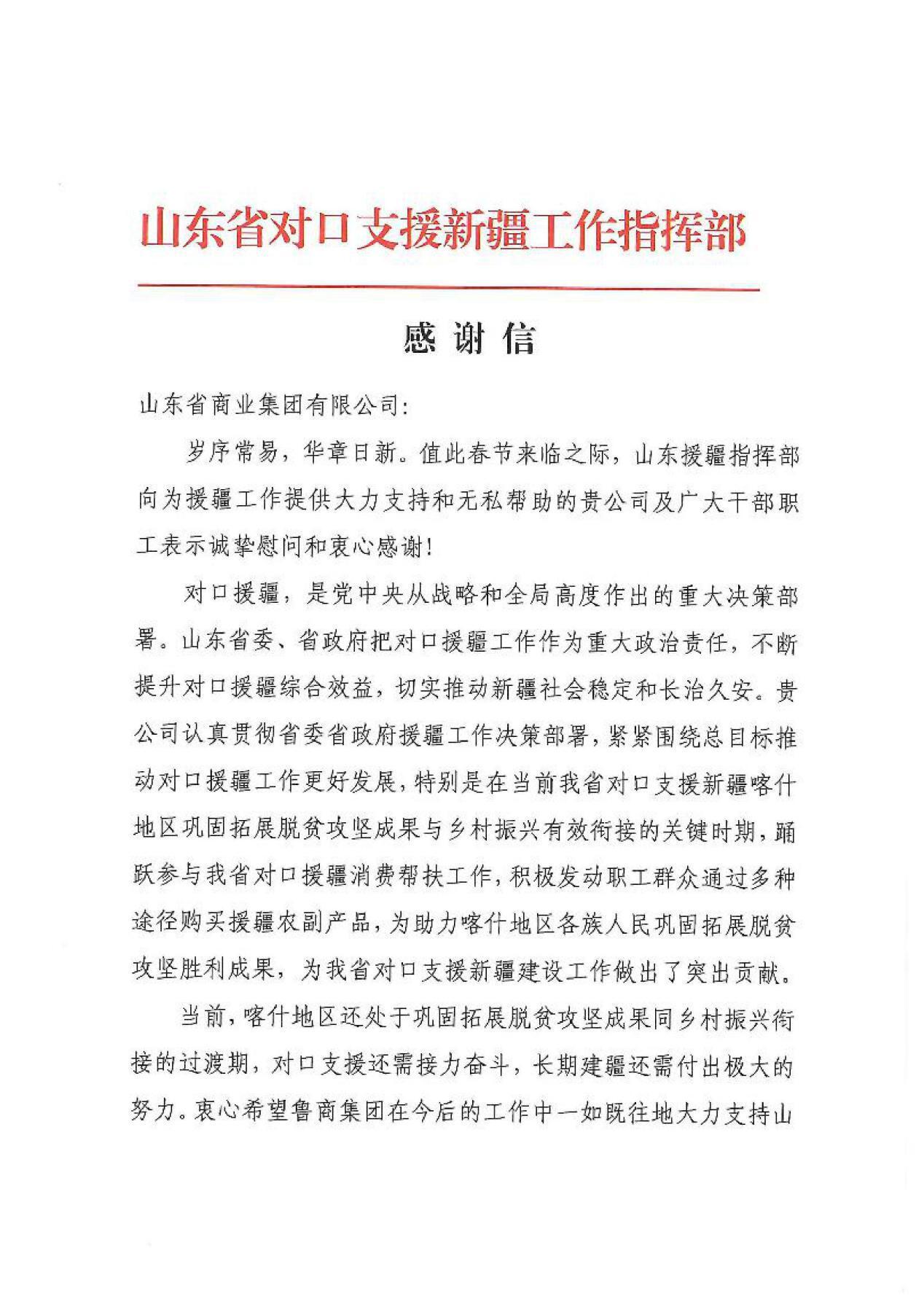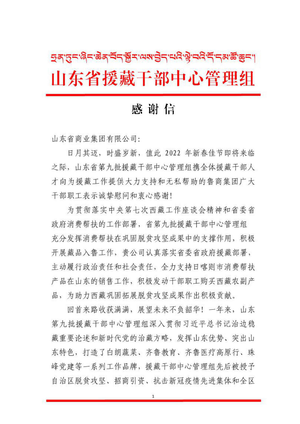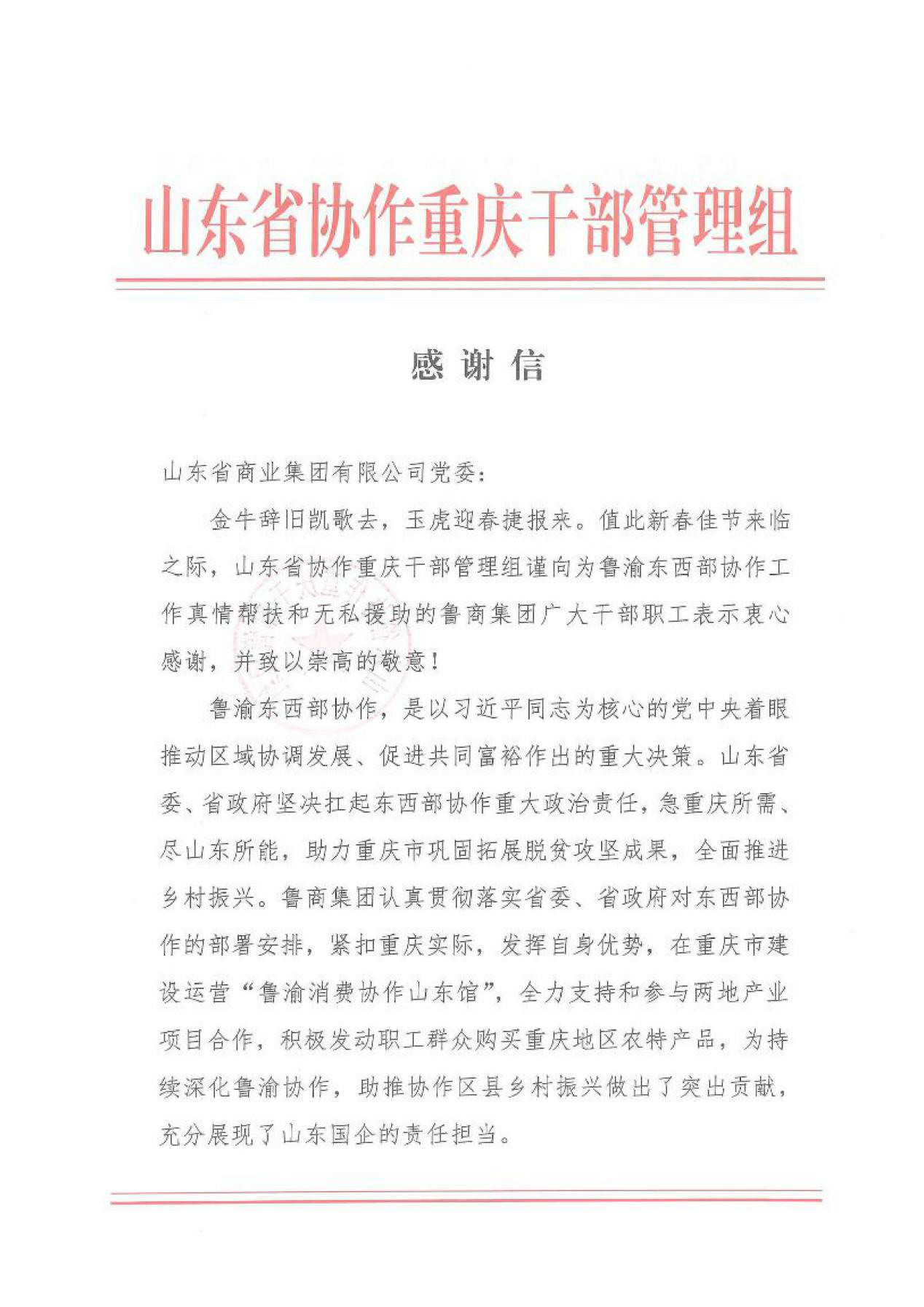 近日,魯商集團分別收到山東省對口支援新疆工作指揮部、山東省第九批援藏干部中心管理組、山東省對口支援青海干部管理組、山東省協(xié)作重慶干部管理組、山東省協(xié)作甘肅干部管理組發(fā)來的感謝信,對集團近年來在對口支援和東西部協(xié)作工作中給予的支持和幫助表示肯定和感謝。